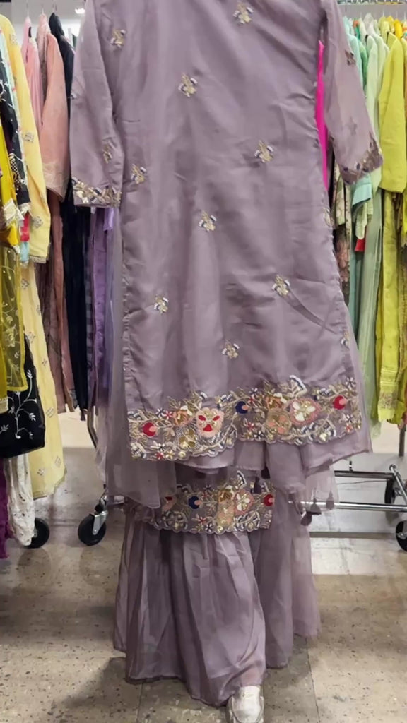 Drape yourself in quiet glamour with this classy, soft and lightweight mauve organza sharara set adorned in delicate floral embroidery. A timeless silhouette that speaks volumes with minimal words.